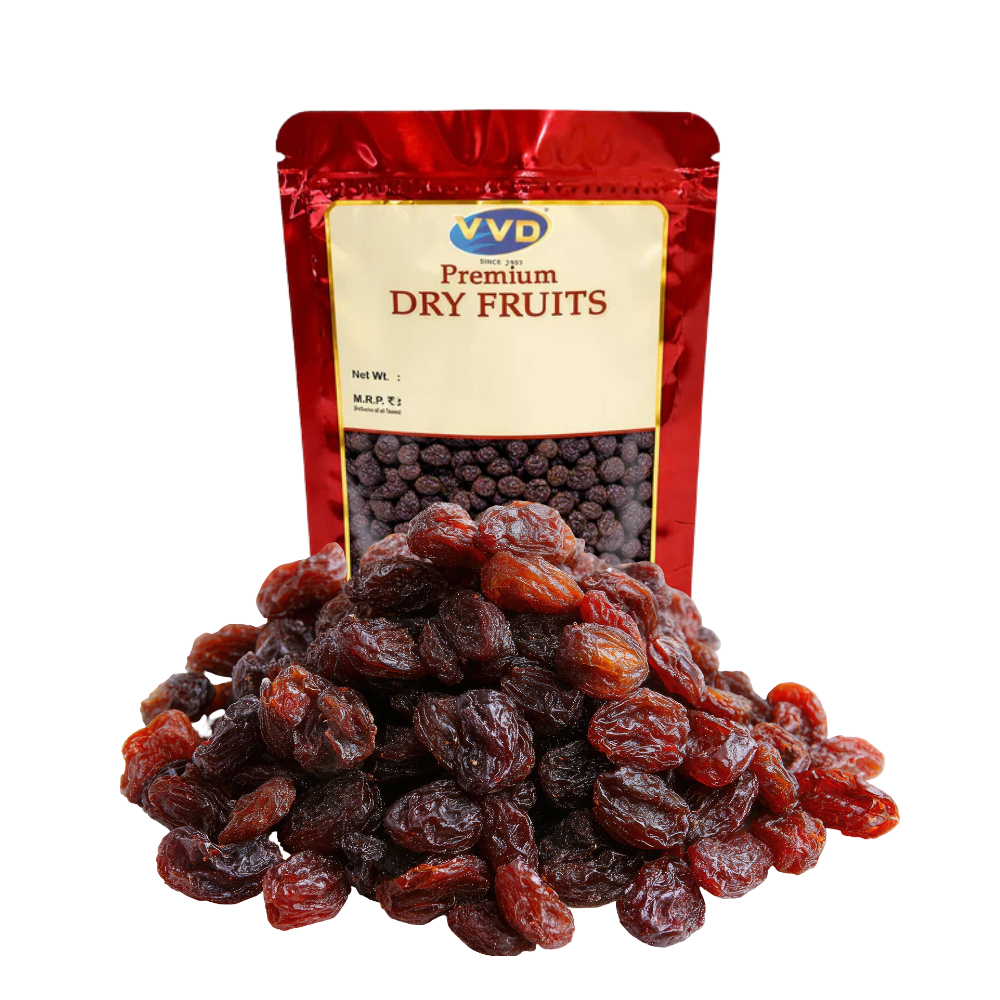 VVD Black Raisins are premium dried grapes known for their natural sweetness and soft texture. These raisins are rich in iron, fiber, and antioxidants, making them a nutritious snack for everyday consumption.